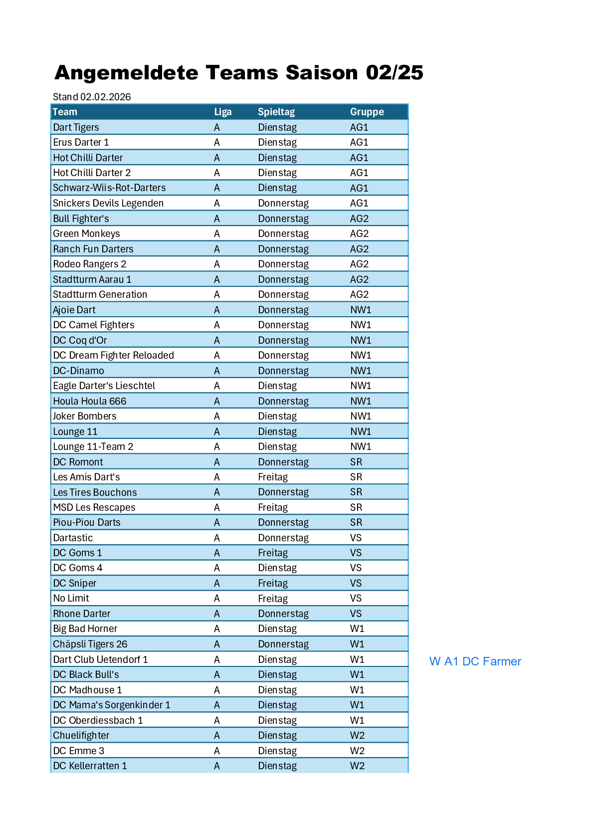 Untenstehende Liste zeigt die eingegangenen Anmeldungen sowie unsere Einteilung. Wir waren bemüht den Spieltag bestmöglichst zu berücksichtigen, unsere Erfahrung hat uns jedoch gelehrt, dass wir ebenso die Region entsprechend gewichten müssen. Allfällige Nachmeldungen können eventuell noch berücksichtigt werden, sofern diese in die Gruppeneinteilung (max. zehn Teams) passen und die Spielpläne noch nicht erstellt sind.